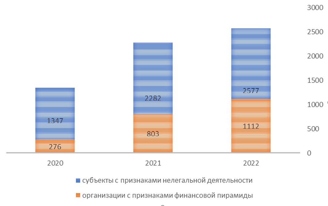 В январе – июне 2022 года Банк России выявил 2288 субъектов (компаний, проектов, индивидуальных предпринимателей и др.) с признаками нелегальной деятельности, в том числе с признаками финансовых пирамид, что превышает количество подобных компаний, выявленных за весь 2021 год. Современные финансовые пирамиды работают в основном в регионах, где наблюдается низкая финансовая грамотность населения. Они очень активно привлекают потребителей, и чаще всего не выплачивают людям денег вообще, даже на начальном этапе, затягивая процесс выхода вкладчиков из финансовой пирамиды. Средняя продолжительность жизни финансовых пирамид сократилась до трех месяцев в среднем. Ранее такой показатель составлял от семи до 10 месяцев.