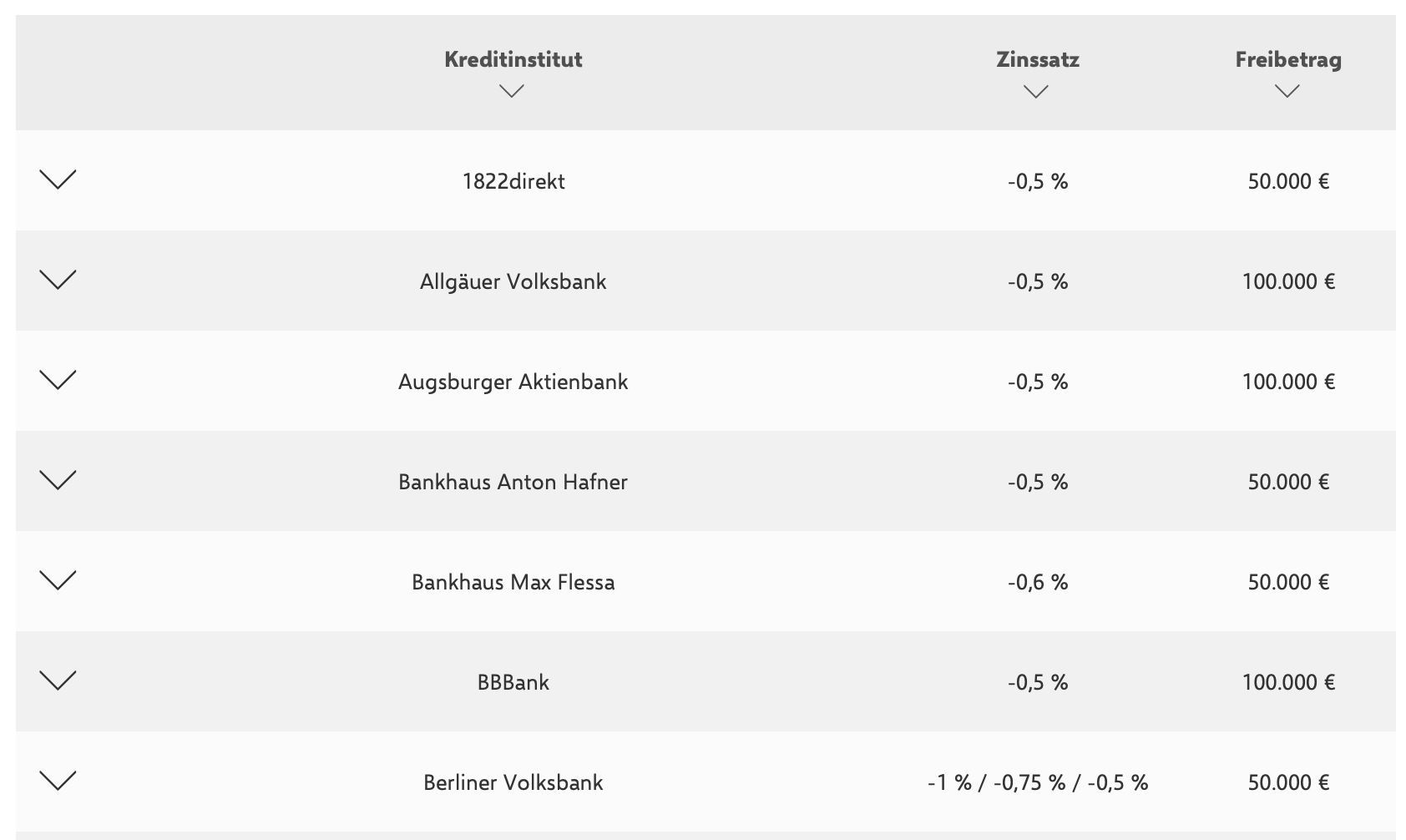 Согласно данным на 17.11.2021, собранным немецким порталом Verivox, 413 банковских организаций предлагали частным лицам отрицательные процентные ставки по депозитам на своих сайтах или в онлайн прейскурантах. Помимо этого, 22 банка взимали плату за ведение обычно бесплатного счета «до востребования», а некоторые банки и сберегательные кассы фактически устанавливали отрицательные процентные ставки, но не публиковали их в Интернете[1]